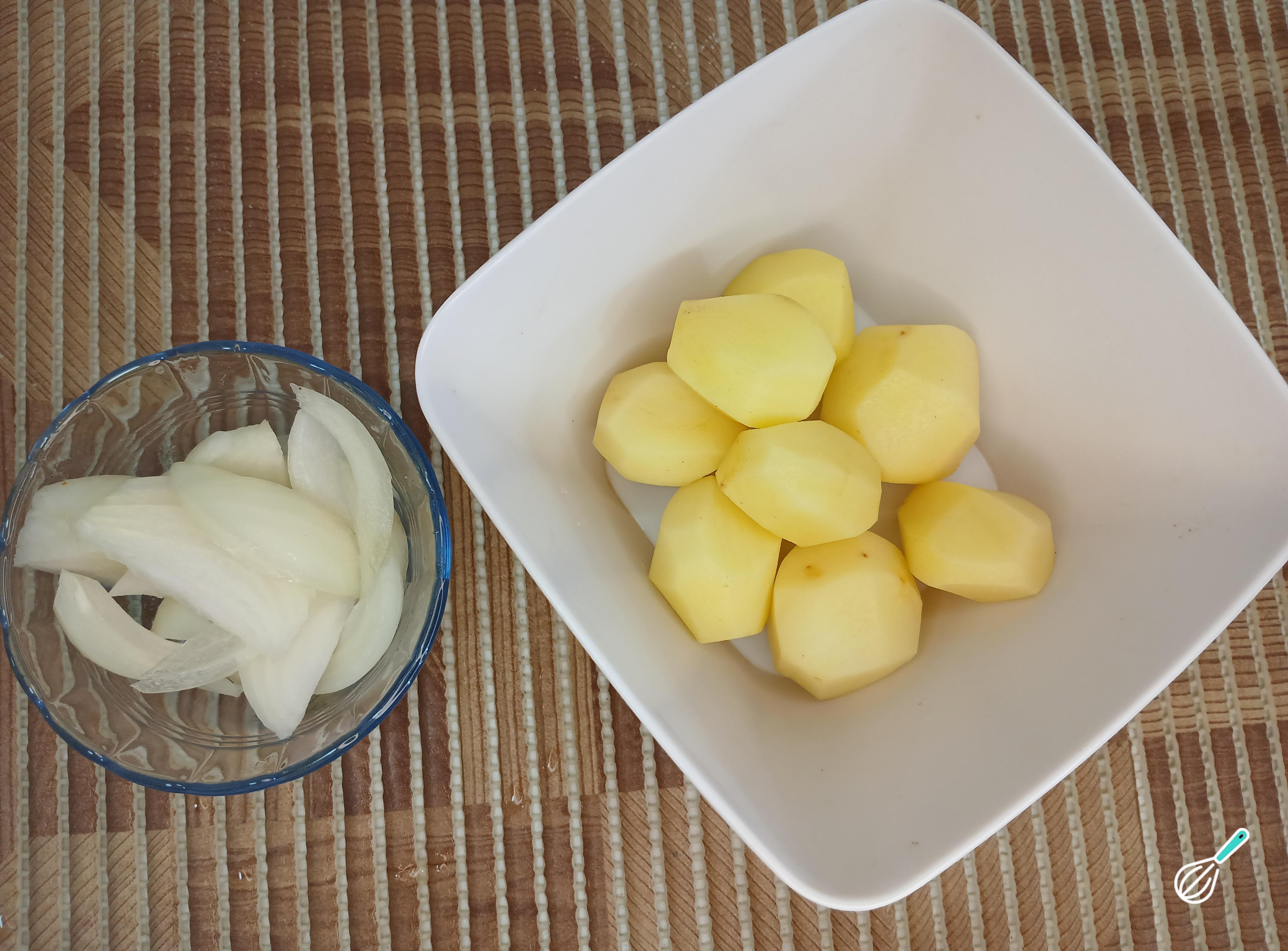 Feito isso, enquanto a carne descansa na geladeira, descasque as batatas bolinha e corte a cebola em meia lua, formato julienne. O ideal é utilizar as batatas bolinhas por serem pequenas. Porém elas podem ser substituídas pelas batatas inglesa ou asterix. Faça conforme a sua preferência.