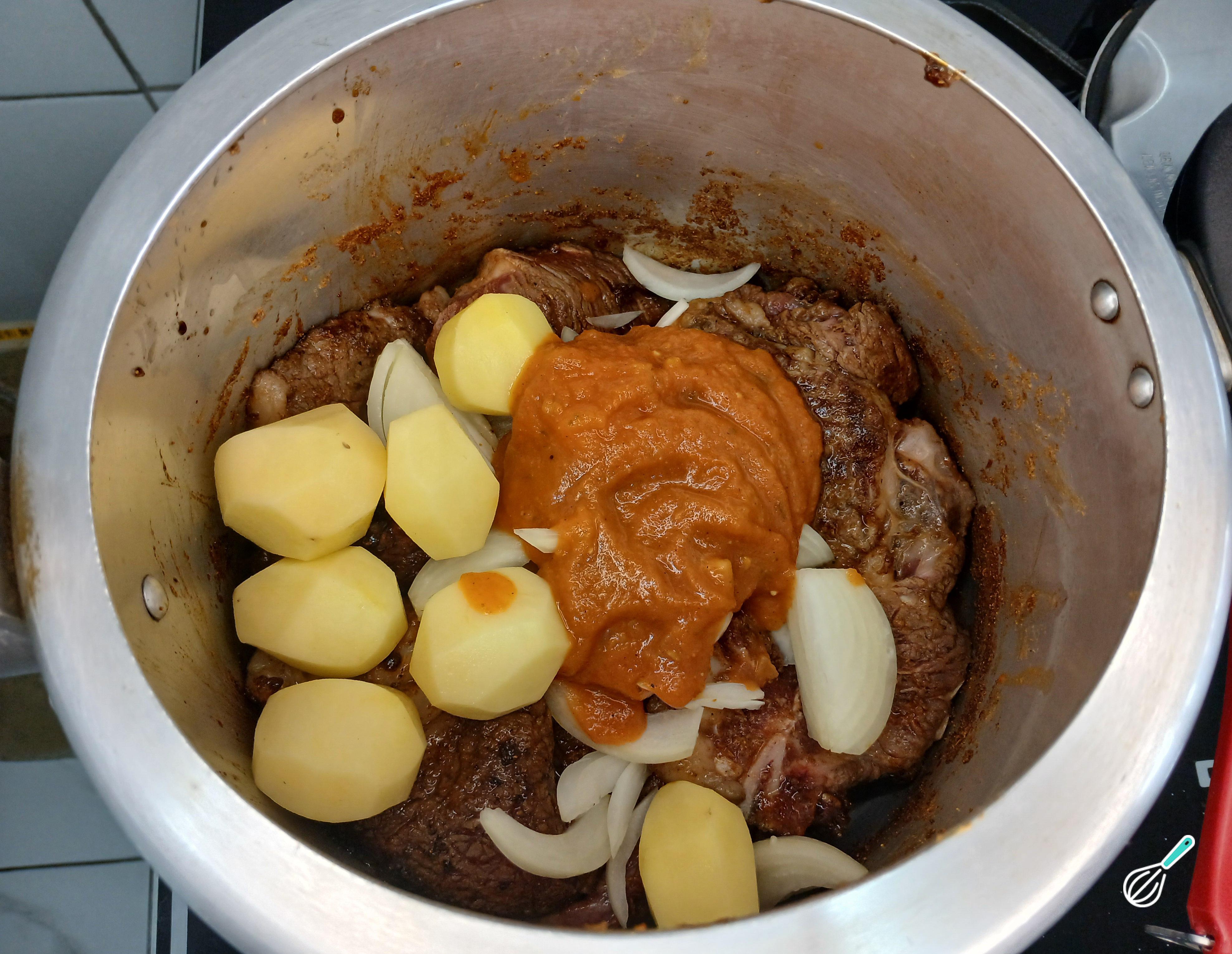 Depois disso, na panela de pressão coloque o óleo de soja e o açúcar mascavo. Em seguida, coloque os bifes de bisteca para dourar. Doure bem dos dois lados. Feito isso, acrescente a cebola e as batatas bolinha. Acrescente também o extrato de tomate. Com uma colher de pau, misture tudo muito bem e em seguida acrescente água que cubra a carne. Tampe a panela e assim que pegar pressão marque 30 minutos. Mantenha o fogo de médio para alto.