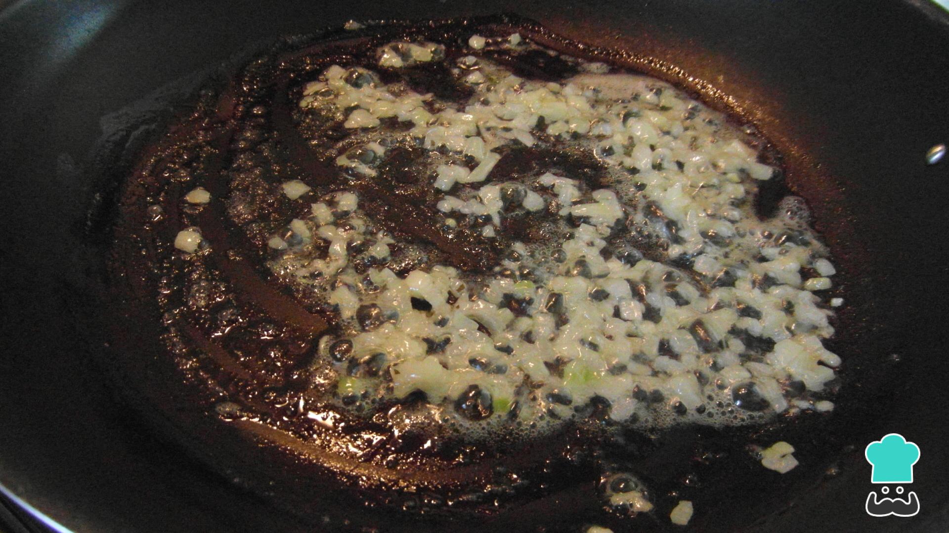 Para fazer essa receita de bisteca ao molho comece por preparar o molho. Para isso rale ou pique finamente a cebola e o alho e refogue em uma panela com o óleo por 4-5 minutos em fogo médio-baixo, ou até dourar.