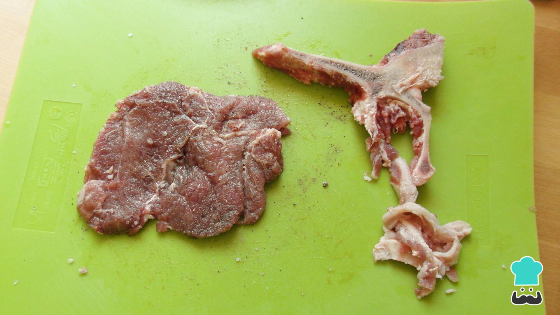 Separe o osso e o excesso de gordura das bistecas, e tempera-as com sal e pimenta do reino. Modere o sal caso tenha escolhido usar um queijo salgado para esta receita.