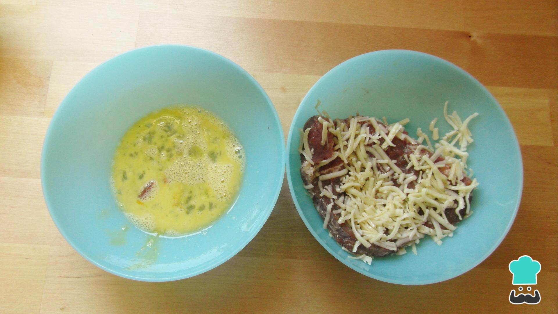 O passo seguinte da bisteca com queijo é mergulhar cada uma numa tigela com os ovos batidos, e empanar com o queijo ralado, pressionando bem para aderir.