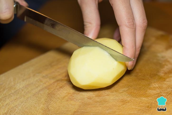 Comece a preparação da bisteca de boi assada descascando as batatas e cortando elas em rodelas. Depois desse passo, coloque as batatas em uma forma ou em um refratário de vidro que possa ir ao forno.