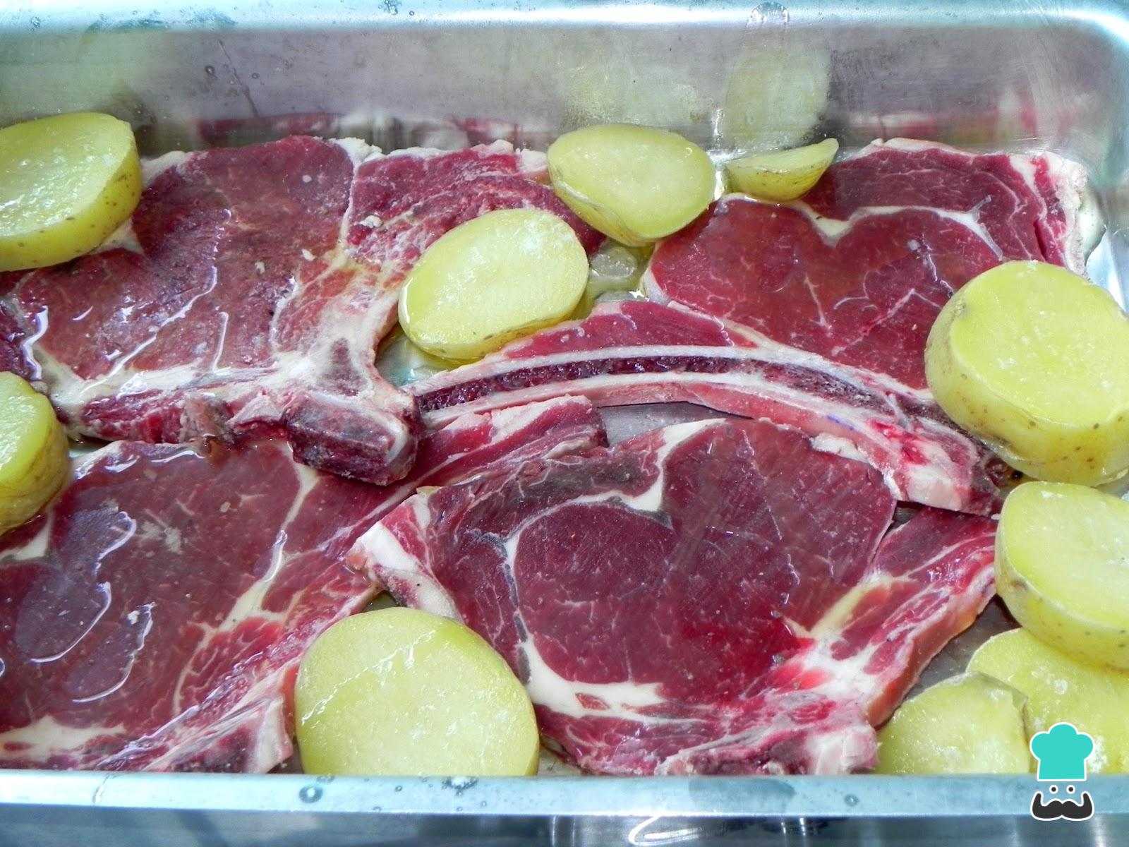 Quando as batatas estiverem mais ou menos 15 minutos no forno, coloque as bistecas escorridas no refratário junto com as batatas, e volte ao forno. Deixe a bisteca de boi assada mais uns 30 minutos assando.