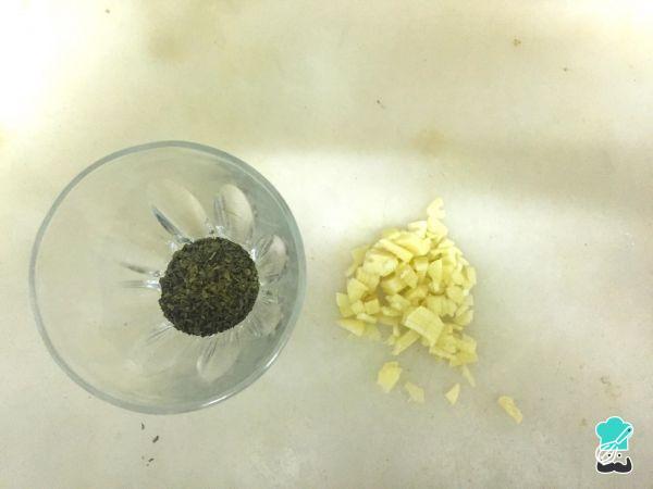 Comece esta receita de bisteca de boi na panela de pressão, por picar muito finamente, o alho, o pimentão, a pimenta calabresa e a salsinha.