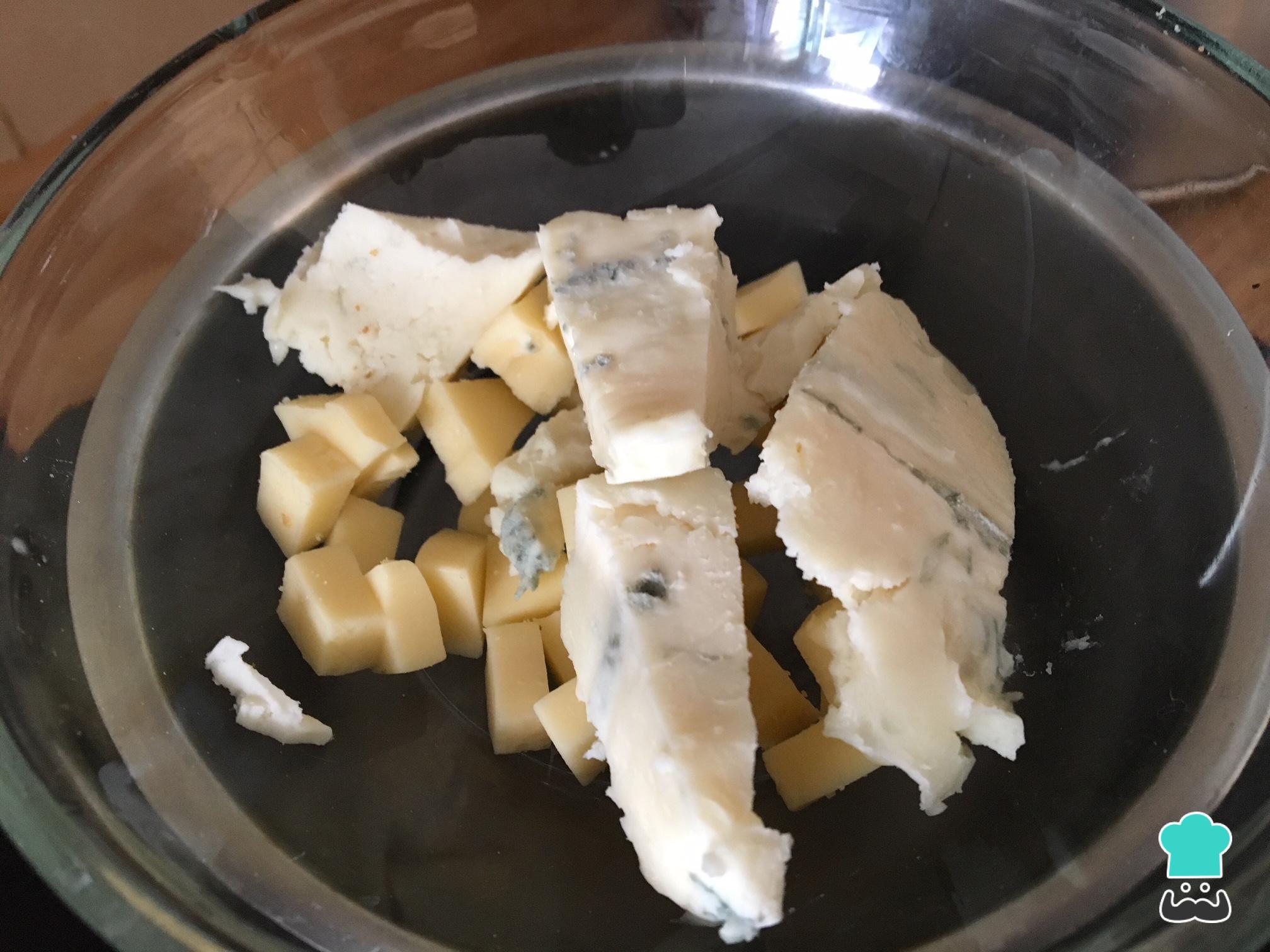 Enquanto isso prepare o molho de queijos em banho-maria no fogão: coloque água numa panela (até ocupar 1/3 da quantidade total), encaixe sobre ela uma vasilha de inox ou vidro temperado com os queijos e o leite dentro. Leve ao fogo médio e mexa de vez em quando até derreter completamente.