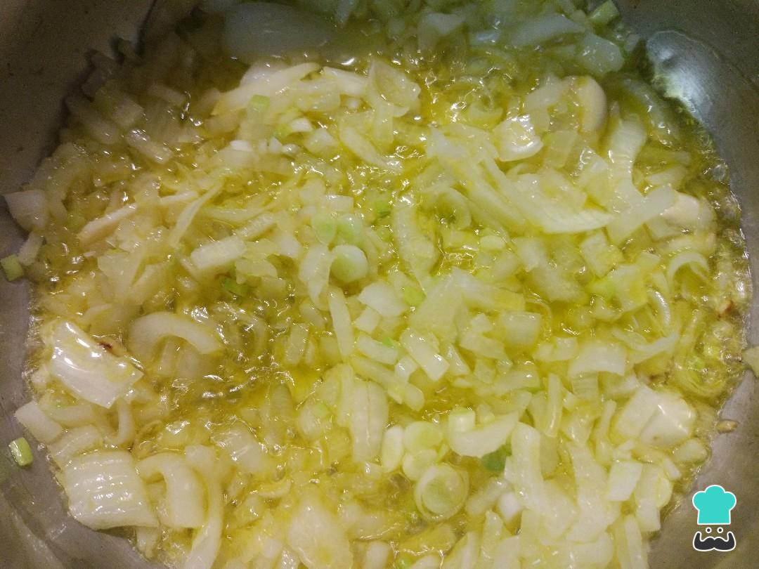 Refogue no azeite o alho e a cebola cortados grosseiramente.