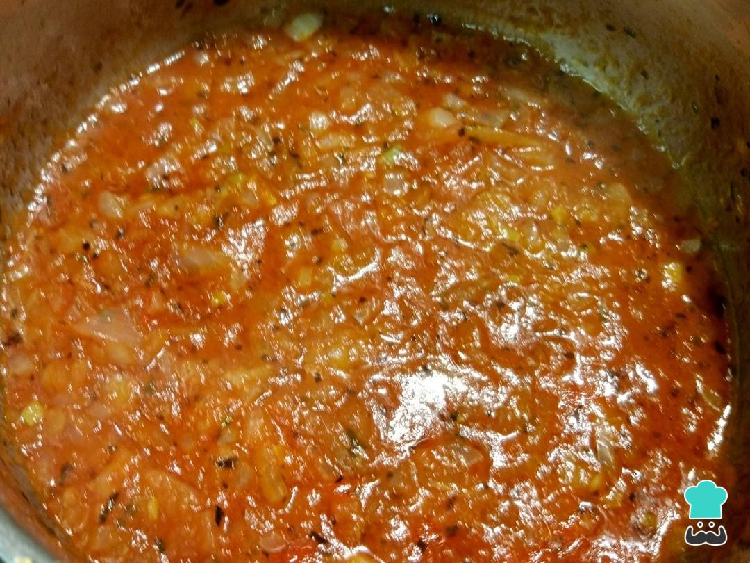 Adicione a polpa de tomate, tempere com o sal e o manjericão seco e deixe ganhar gosto. Coloque os cogumelos e misture.
