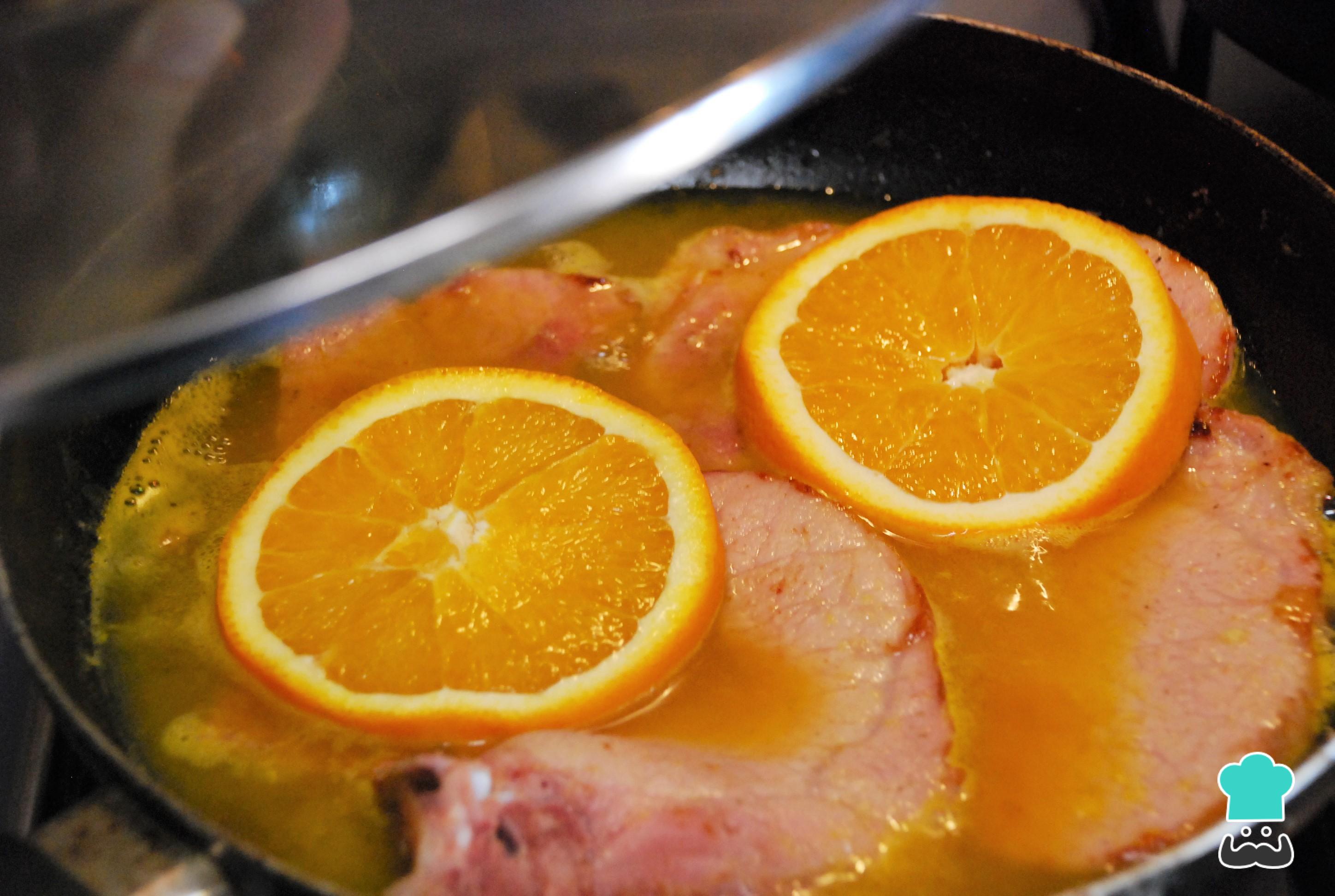 Depois de alguns minutos, quando o suco começar fervendo, coloque as rodelas de laranja sobre a carne e tampe a frigideira. Baixe o fogo e continue cozinhando.