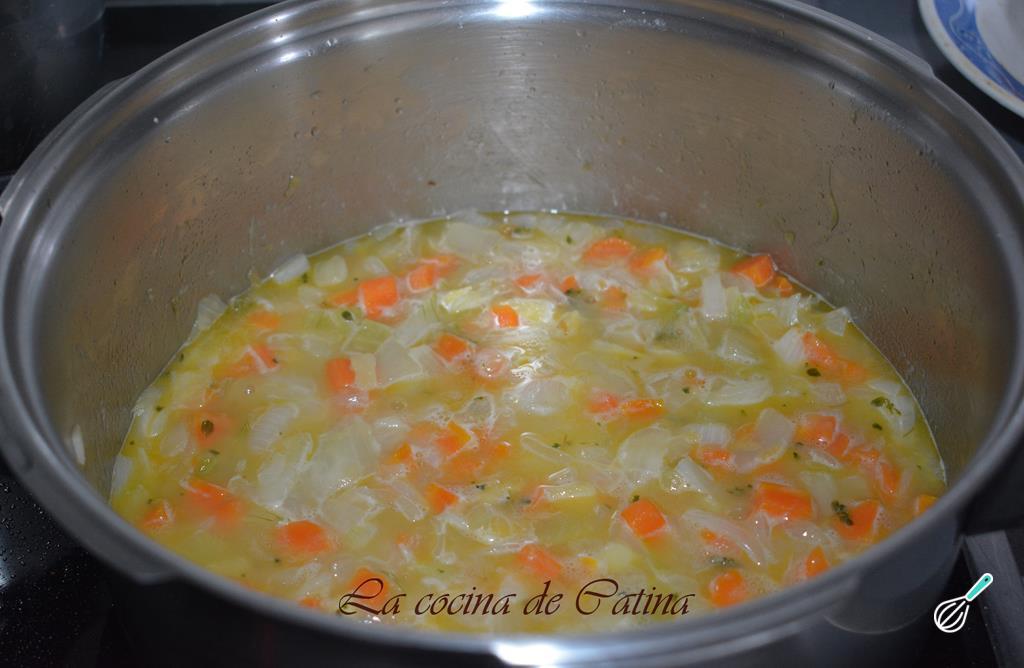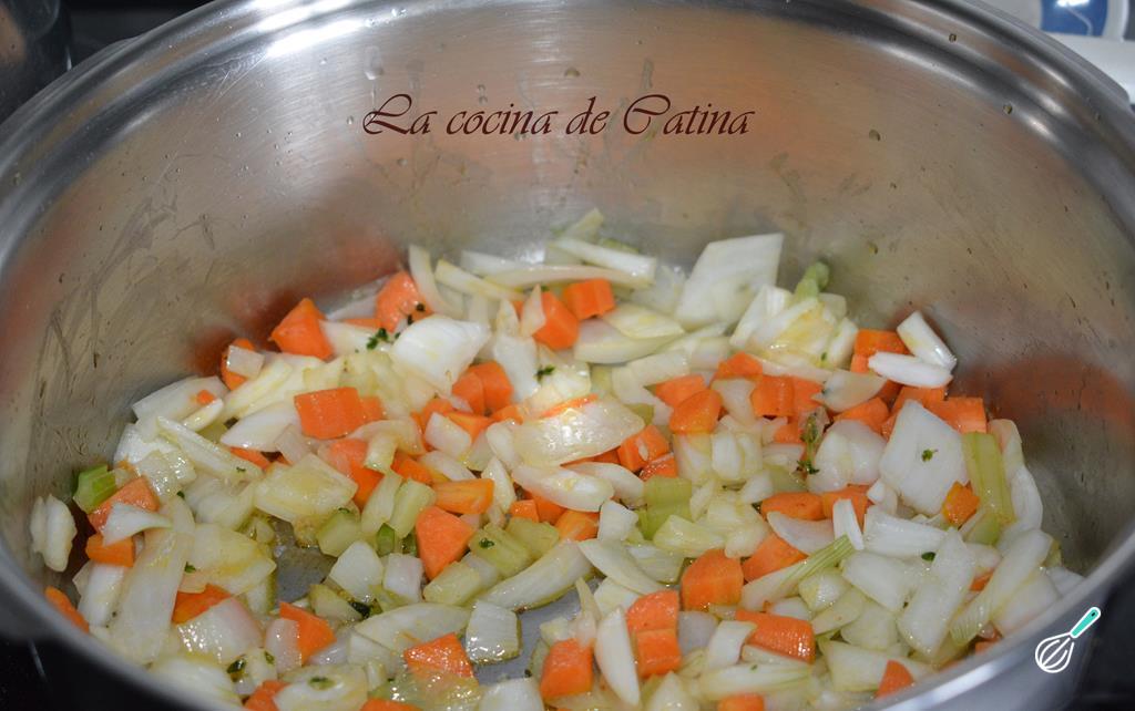 Pique, o tomilho, o aipo, as cenouras, as cebolas, o gengibre, coloque na panela de pressão, juntamente com um pouco de azeite e deixe dourar por 10 minutos em fogo médio.