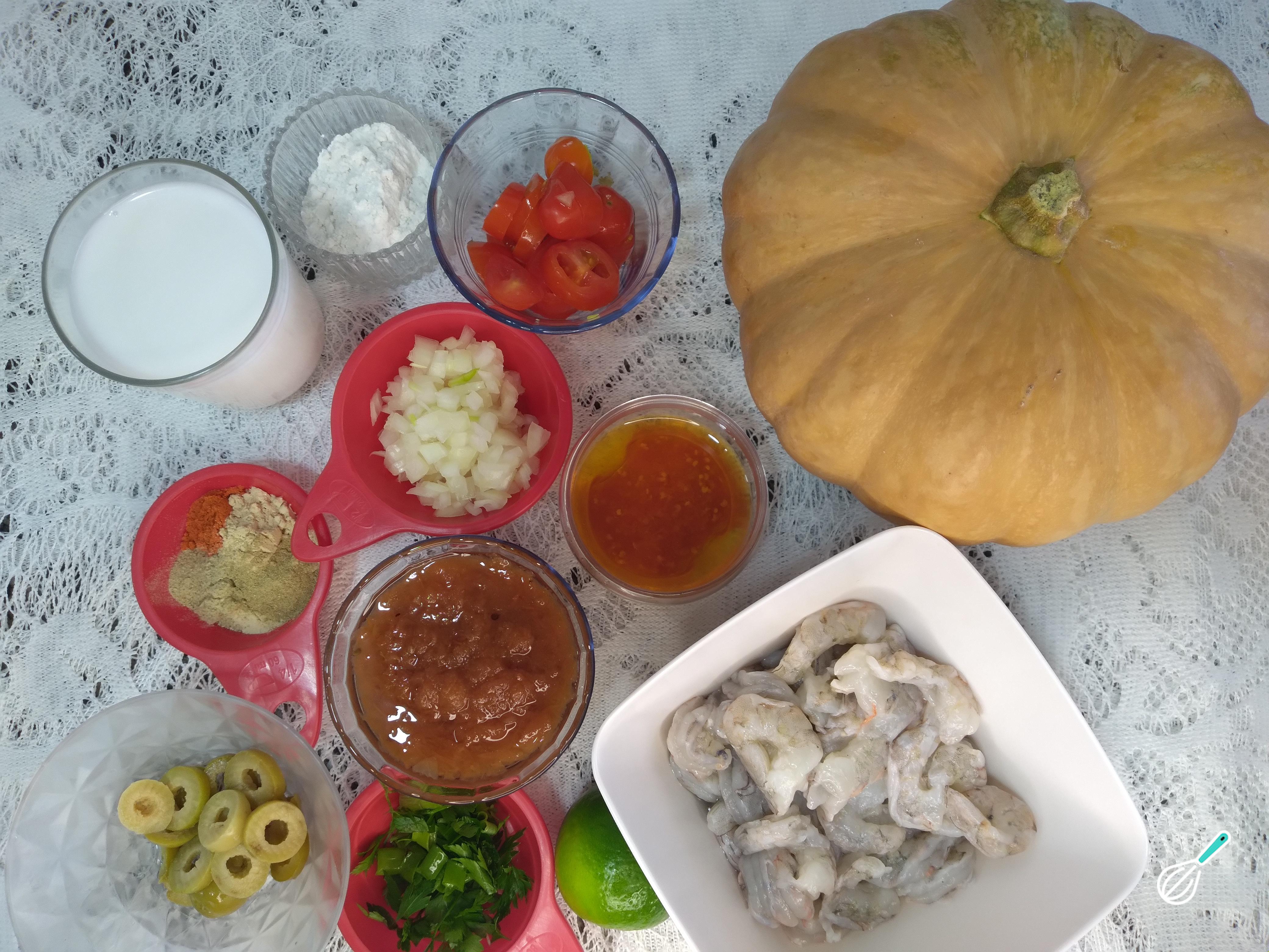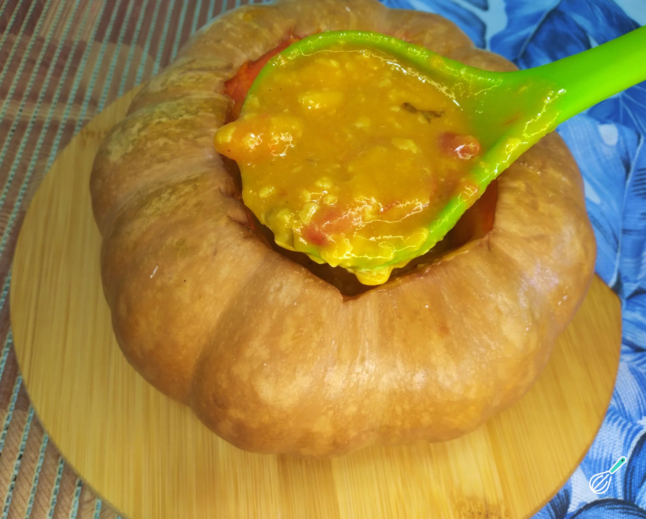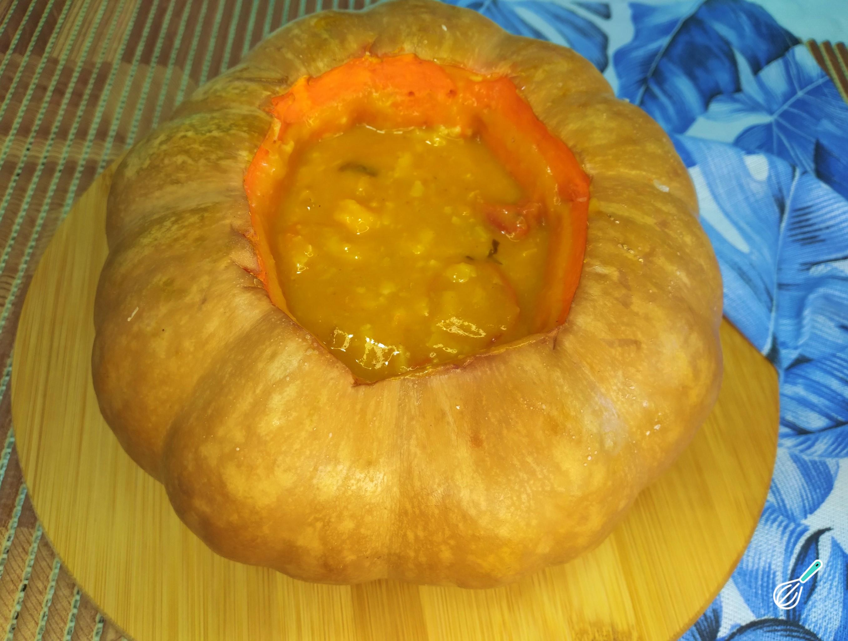 Transfira o bobó de camarão para a moranga já assada e leve ao forno por aproximadamente 20 minutos 200 graus.