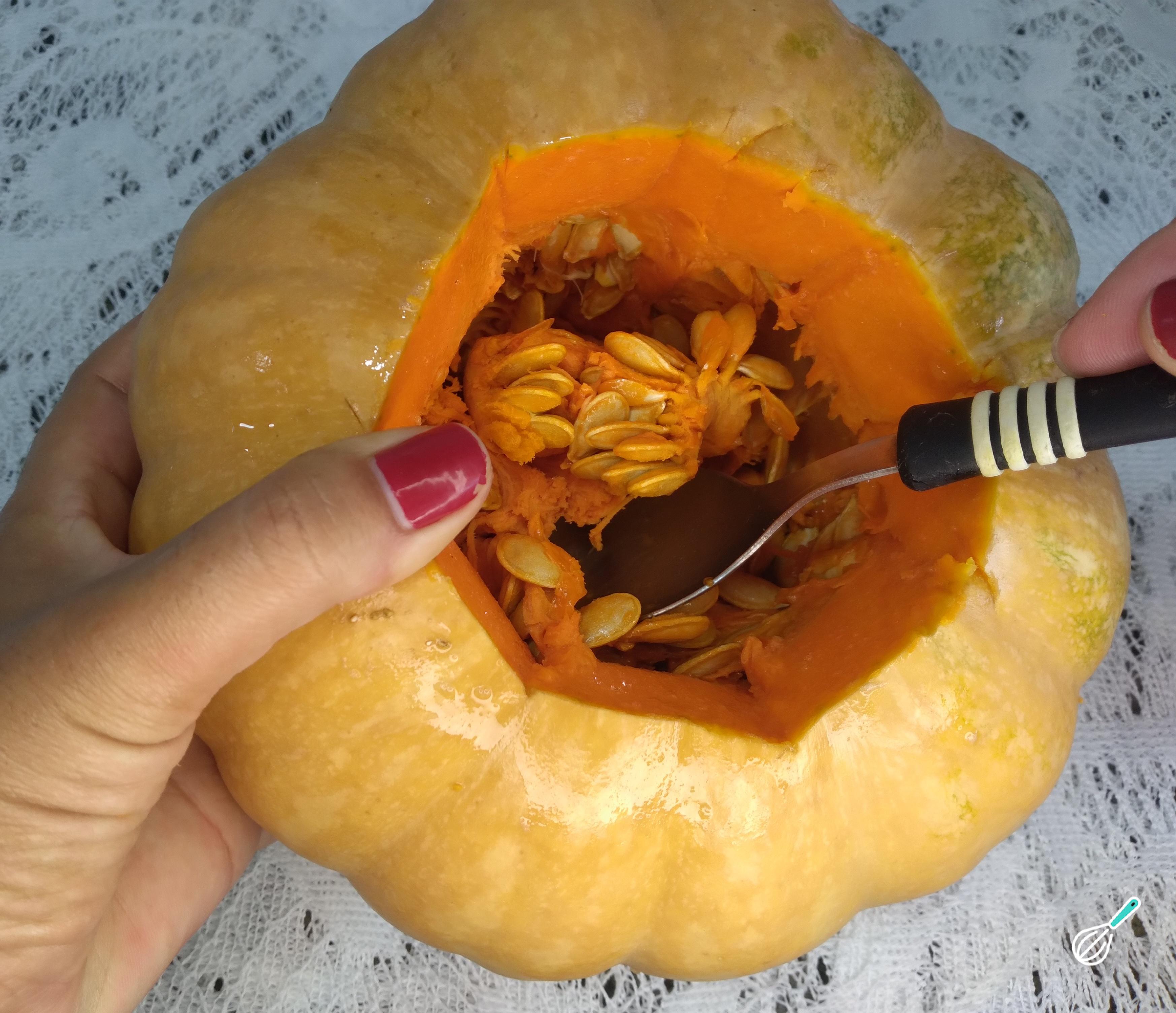 Feito isso, com uma faca retire a tampa da abóbora, com cuidado. Com o auxílio de uma colher, retire as sementes. Coloque a abóbora em uma assadeira e leve ao forno a 220 graus. Quando a abóbora estiver macia, retire do forno. Espete com um garfo ou uma faca.