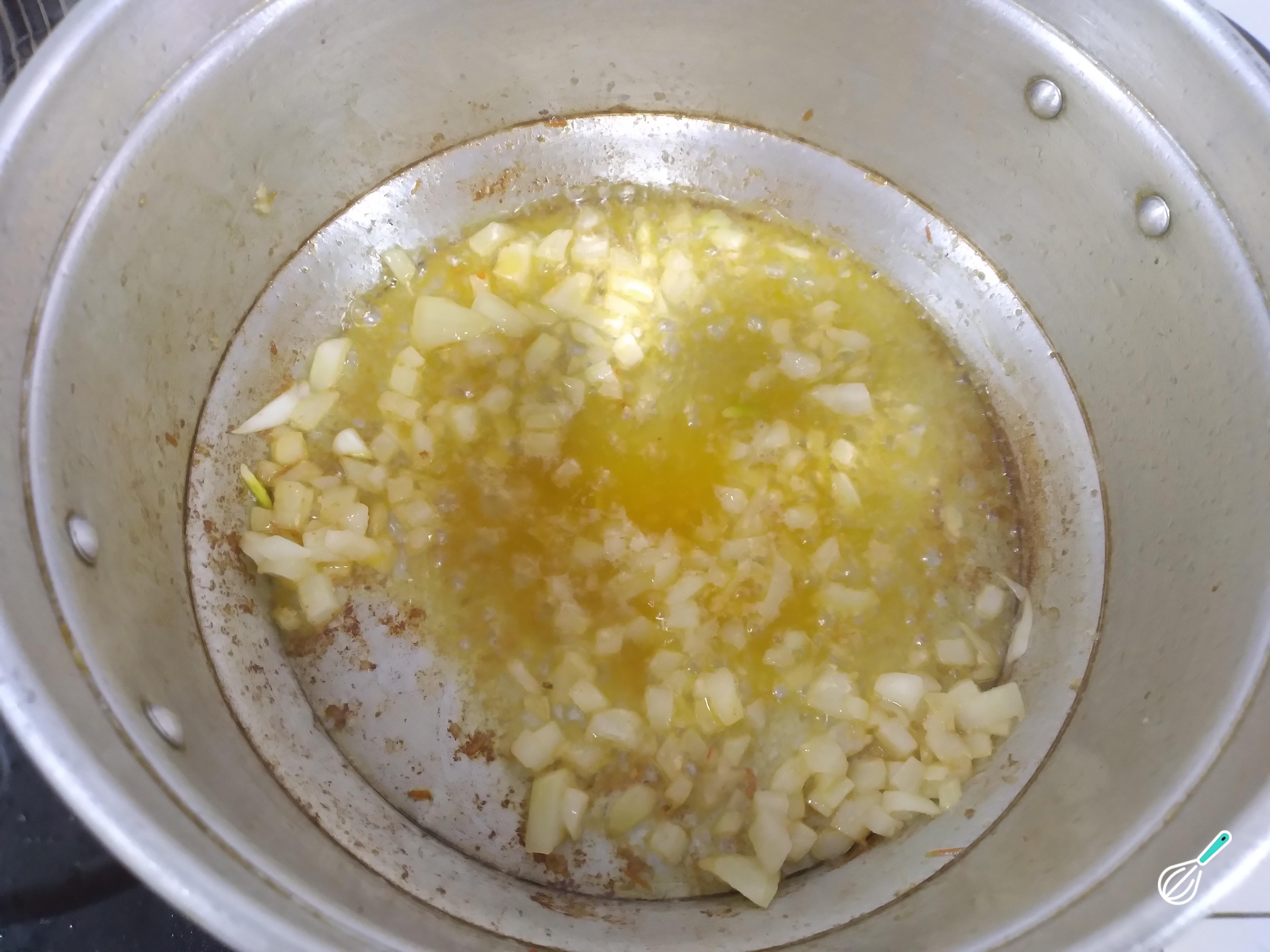 Quando os camarões já estiverem dourados, retire-os da panela, coloque em um prato e acrescente a cebola picada nessa panela. Mexa para que refogue e solte líquidos. Use uma colher de silicone.
