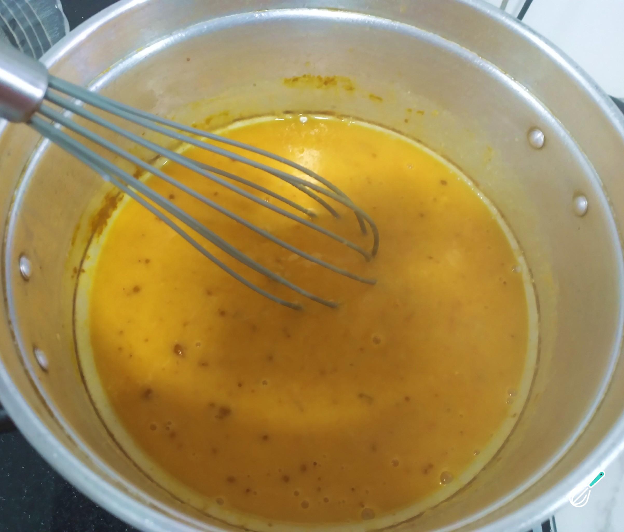 Em seguida, acrescente a farinha de arroz e com o auxílio de um fouet mexa até dissolver. Nesta hora, acrescente o caldo de camarões reservado e os temperos. Mexa bem.