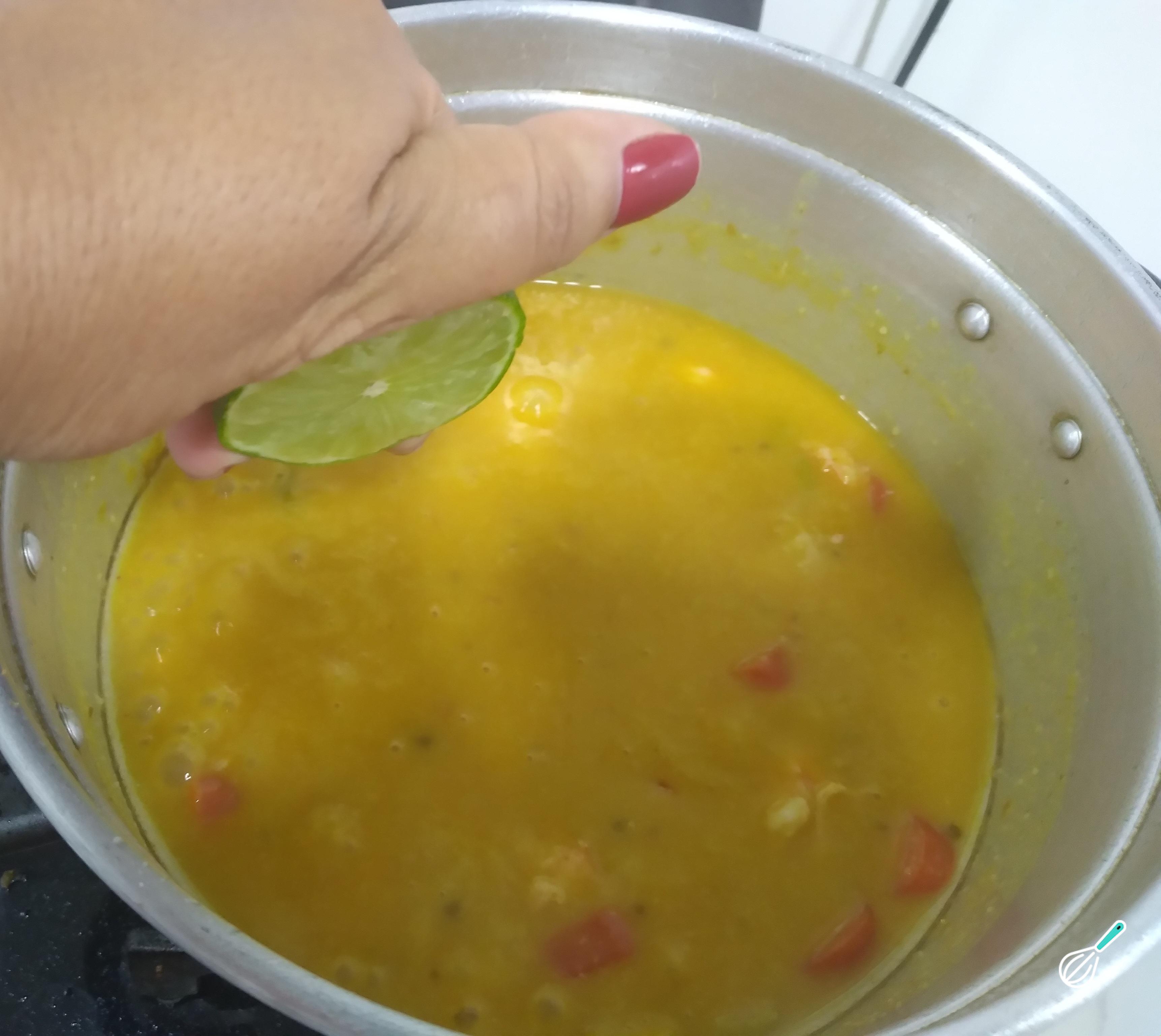 Por último, a acrescente os tomates, as azeitonas, a cebolinha verde e salsinha e o suco de limão. Acerte o sal. Mexa bem e deixe cozinhar e encorpar.