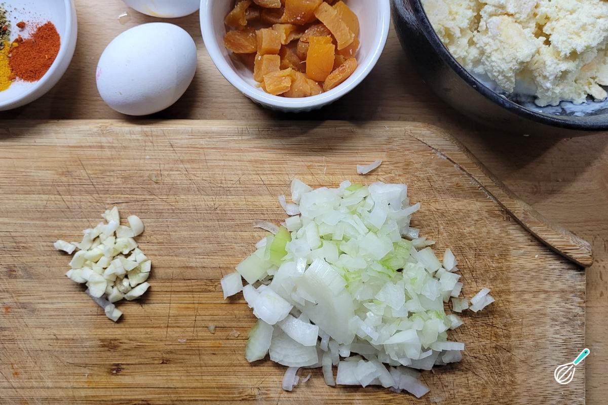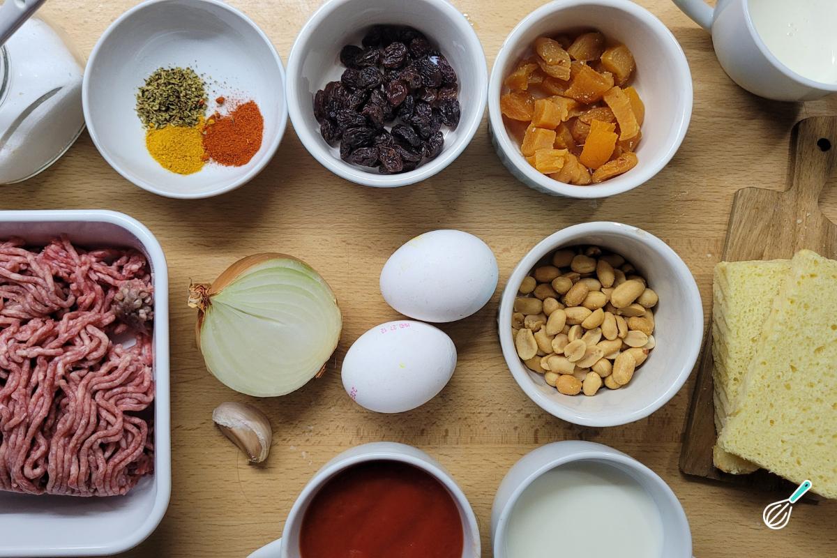 Separe os ingredientes para fazer o bobotie. Você pode substituir as frutas secas pelas que preferir, assim como o amendoim por nozes ou castanhas.
