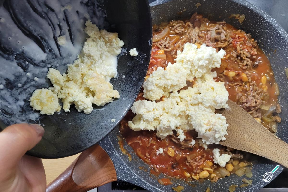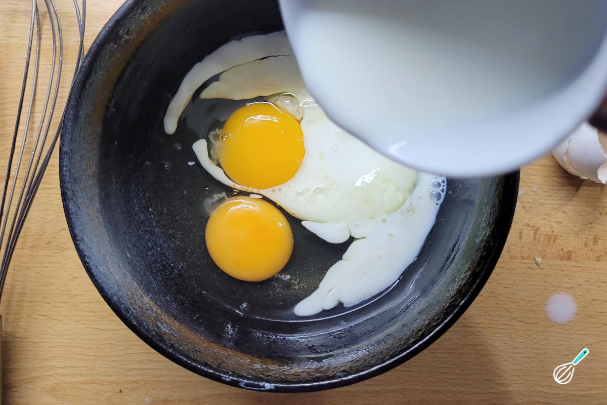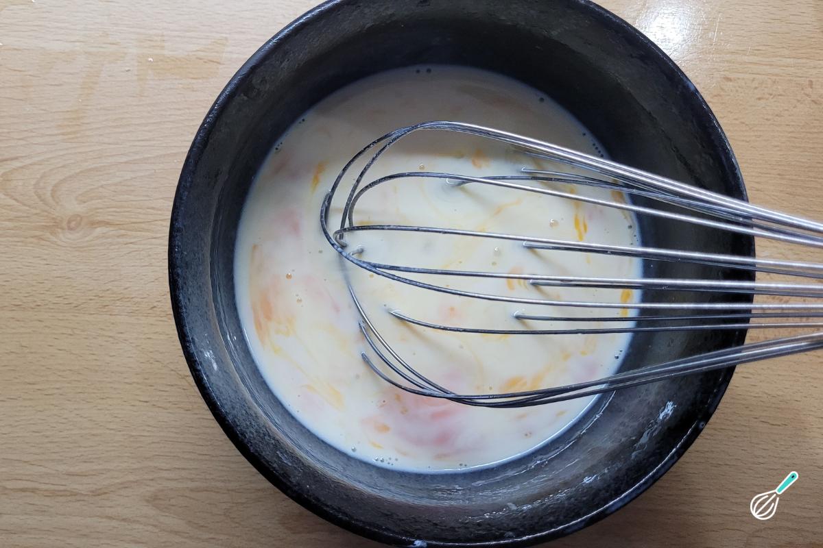 Para a cobertura, coloque os ovos em uma tigela e misture com o leite.