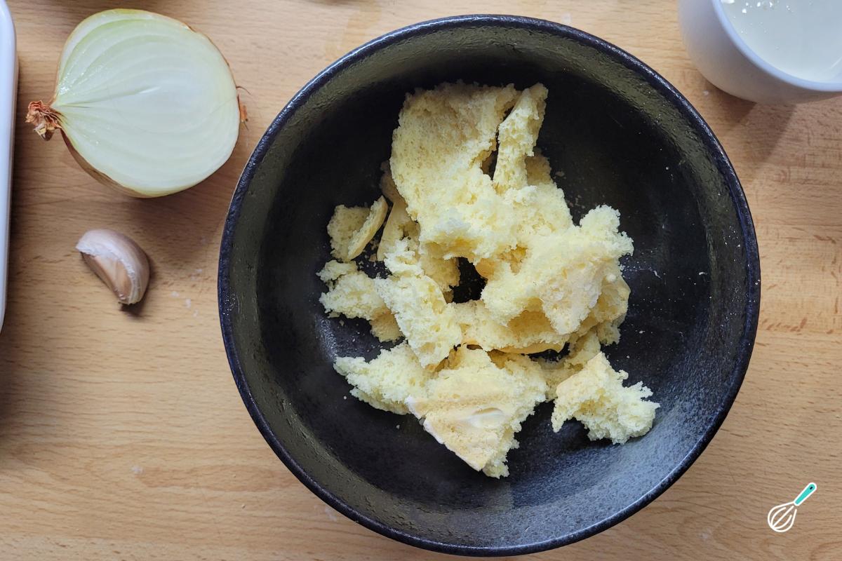 Começamos pelo recheio e o primeiro passo é hidratar o pão. Quebre o pão em pedaços menores e coloque em uma tigela. Não se preocupe em cortar em pedaços regulares.
