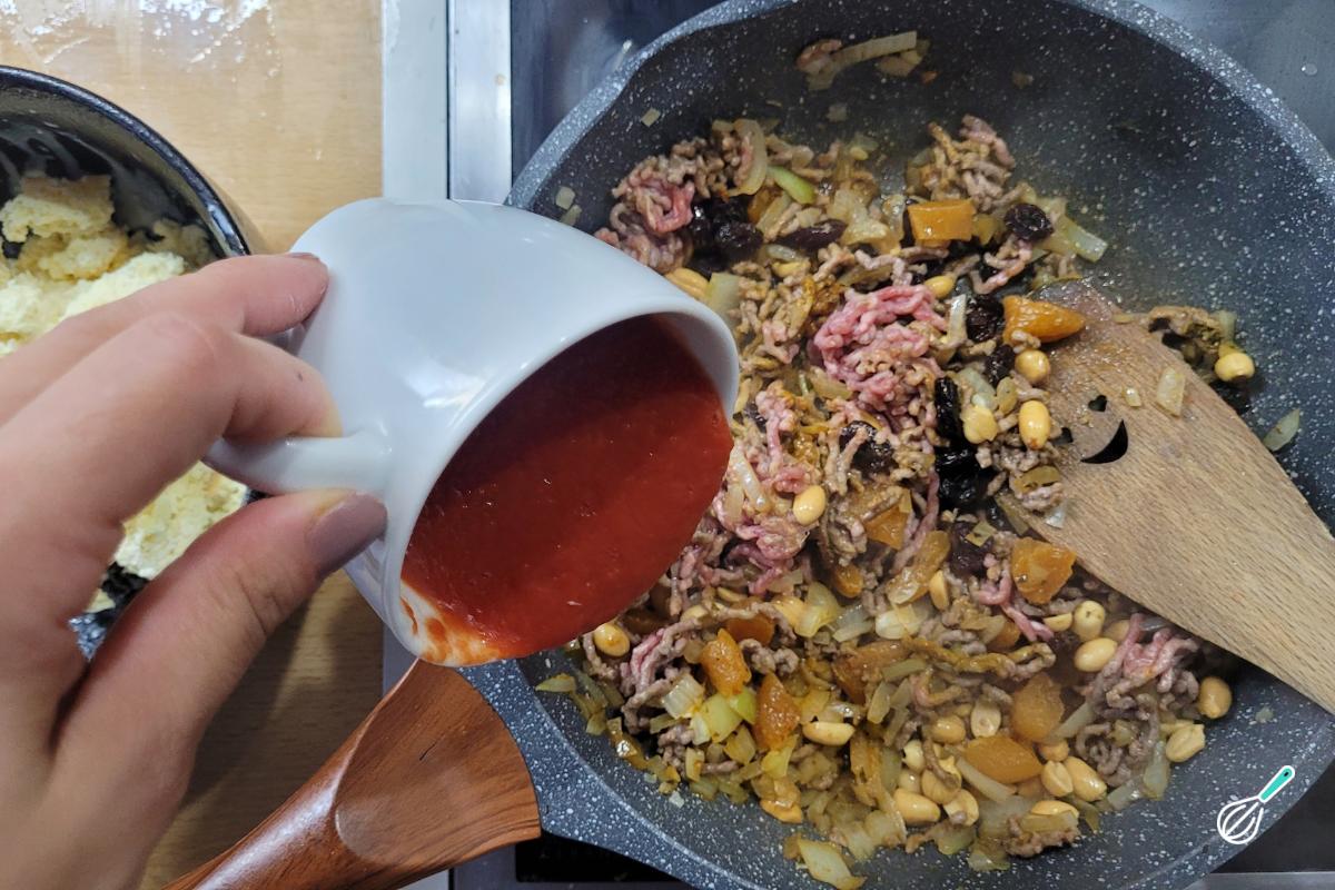 Quando a carne tiver dourado, adicione o alho, as frutas secas e a passata de tomate. Coloque um pouquinho de água se necessário. Deixe apurar até a carne terminar de cozinhar e ter um molho espesso.