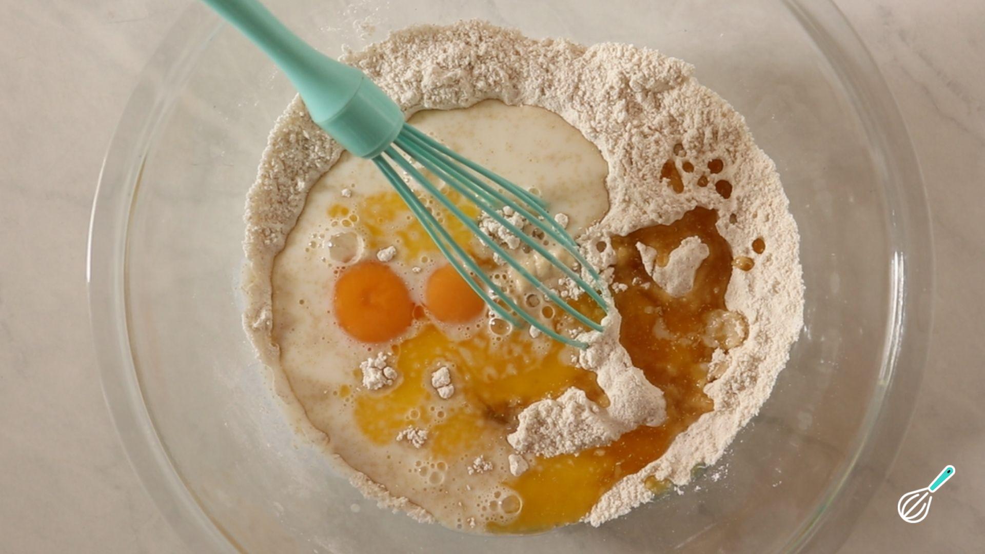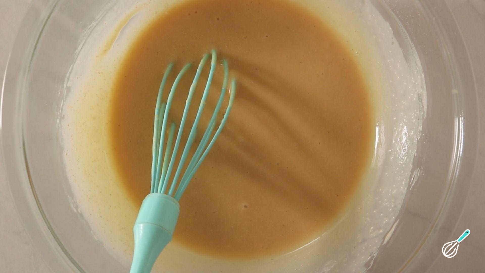 Junte o leite morno, a manteiga derretida, as gemas e o extrato de baunilha e misture bem.