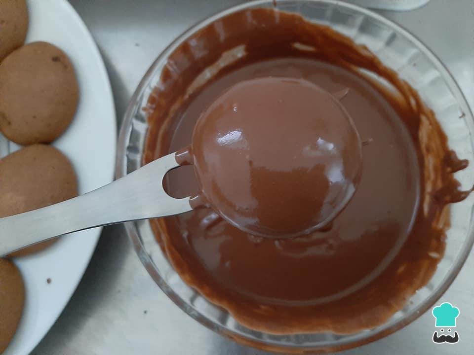 Derreta o chocolate em barra em banho maria ou no micro-ondas - confira nossas dicas de como derreter chocolate em barra - e disponha-o numa tigela que permita banhar as bolachas com facilidade. Com o auxílio de um garfo longo (desses com 2 ou 3 dentes), banhe as bolachas uma a uma e escorra o excesso de chocolate, dando leves batidinhas com a bolacha na tigela.