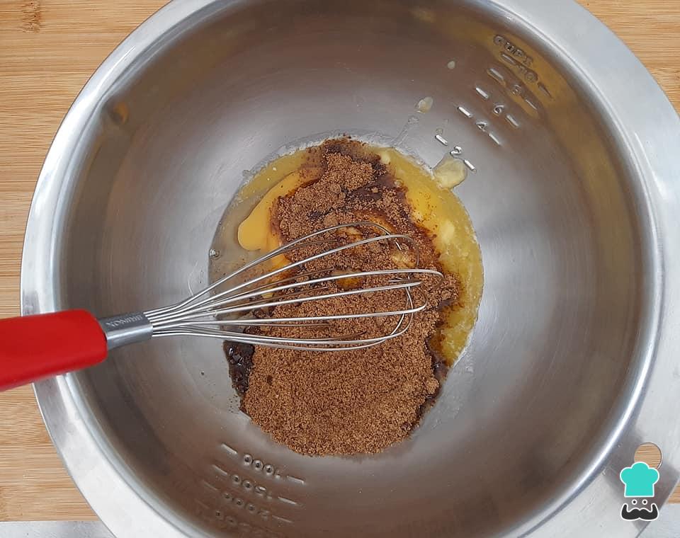 Num bowl misture o açúcar mascavo, o ovo e manteiga derretida.