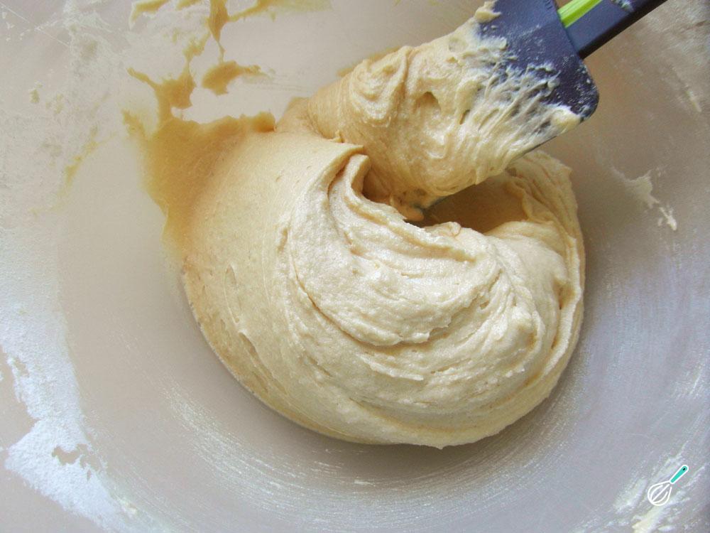 Adicione a farinha e envolva muito bem com uma espátula, já que a massa começará a ficar pesada.
