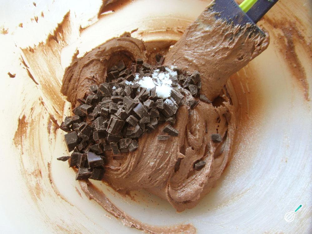 Adicione também o chocolate e o café e misture muito bem com a espátula. Por fim acrescente os pedaços de chocolate, o bicarbonato e o sal e envolva na massa dessa bolacha de chocolate.