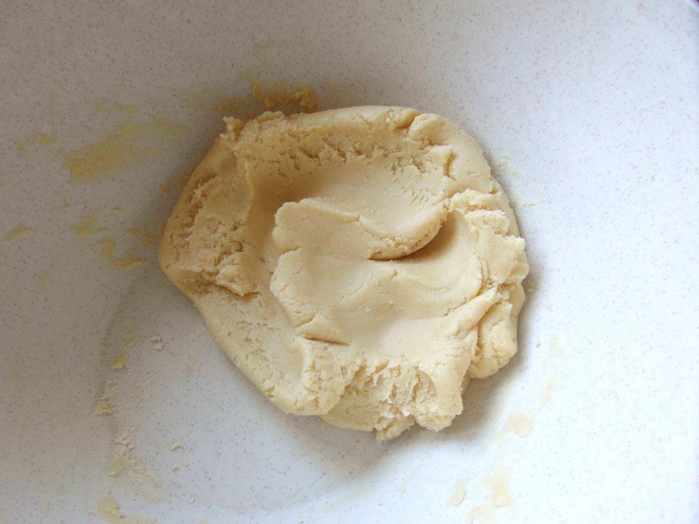 Coloque os restantes ingredientes em uma tigela e adicione as farinhas pouco a pouco, mexendo primeiro com uma colher e depois com as mãos, até a massa de bolacha de nata fácil desgrudar e ficar lisa.