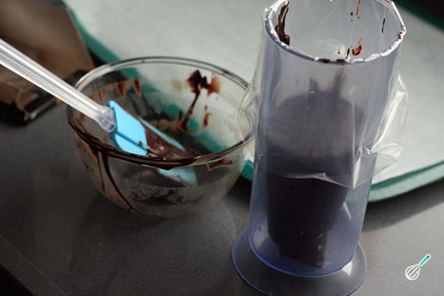 Se você também não tem gotas de chocolate, derreta chocolate em banho Maria juntamente com a manteiga. Mexa para que estes ingredientes fiquem bem integrados e transfira a mistura para um saco de confeiteiro.