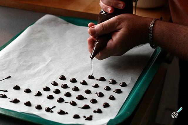Forre uma assadeira com papel manteiga e, pouco a pouco e com muita paciência, coloque pequenos pedaços de chocolate com o saco de confeiteiro.. Pode fazê-los do tamanho que você quiser, mas para as bolachas é melhor que sejam pequenas. Reserve na geladeira para endurecer.