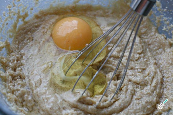 Uma vez integrados os ingredientes anteriores, adicione os ovos um a um e continue batendo. A mistura deve crescer à medida que bate.