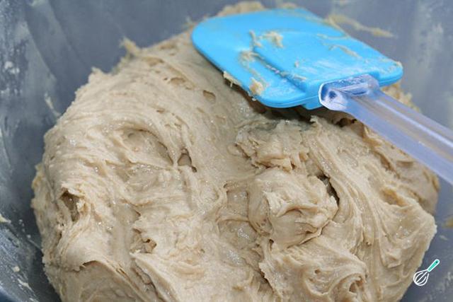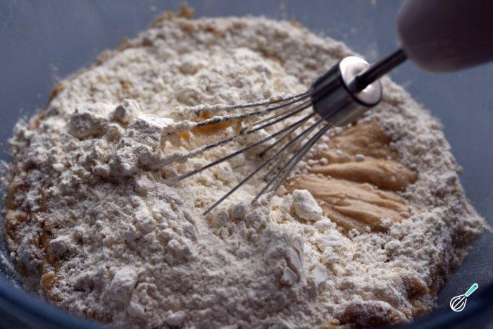 Para continuar com a preparação da massa das bolachas Chips Ahoy, adicione a farinha e misture cuidadosamente. Não devem ficar grumos.