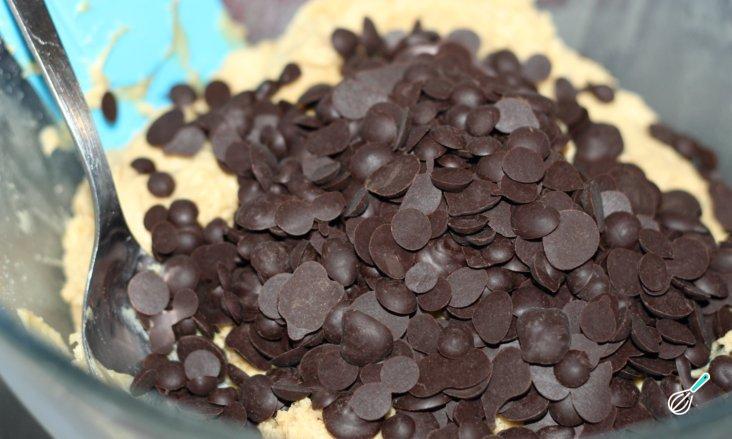 Adicione as gotas de chocolate na tigela com a massa e misture com as mãos. Se você desejar adicionar nozes picadas, agora é a hora. Pré-aqueça o forno a 180 ° C.