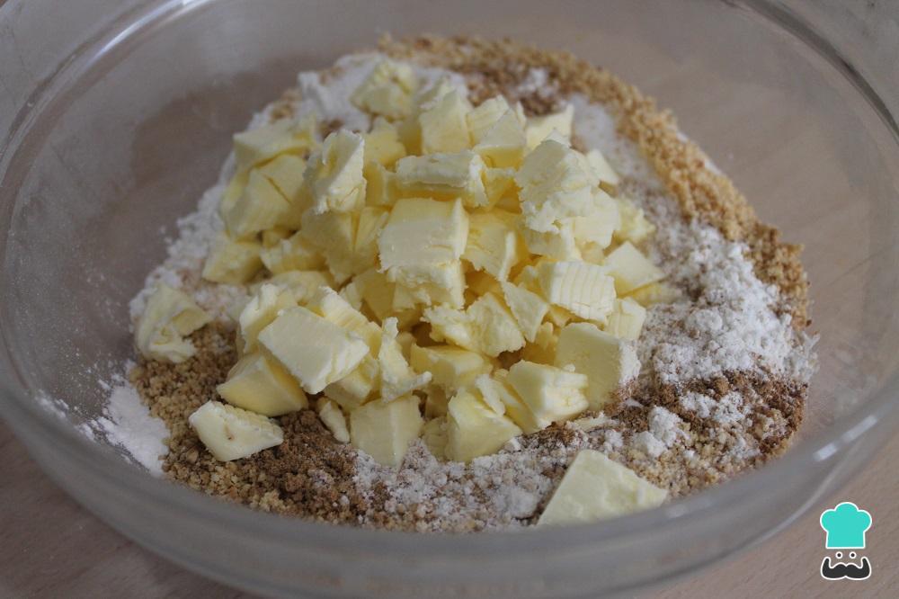 Coloque as avelãs moídas num bowl e adicione a farinha, o açúcar, a mistura de especiarias e a manteiga fria cortada em cubos. Amasse com as mãos até obter uma consistência esfarelada.