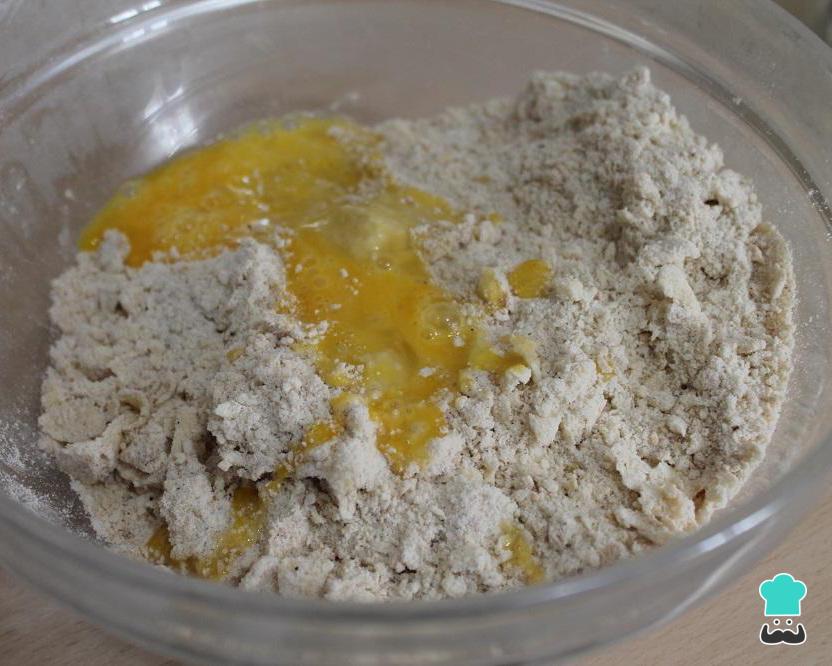 Bata o ovo levemente e adicione na mistura anterior. Amasse com as mãos novamente, desta vez até obter uma massa mais consistente e fácil de modelar.