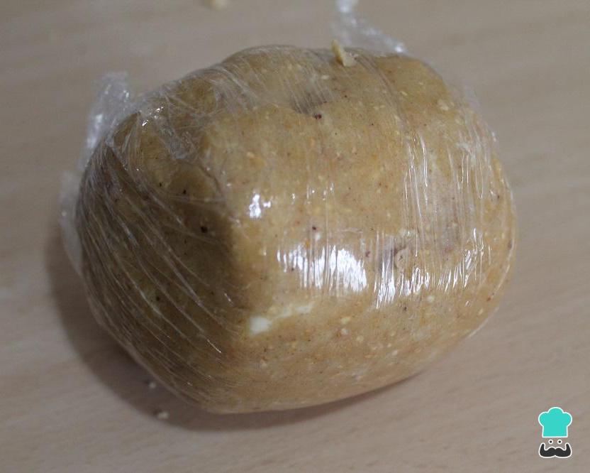 Modele a massa em forma de bola, envolva em plástico filme e reserve na geladeira por, no mínimo, 30 minutos ou até ficar bem gelada. Isso é importante para conseguir uma massa de bolacha de Natal mais firme.