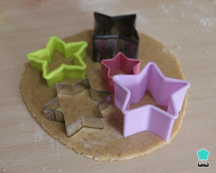 Após o tempo indicado no passo anterior pré-aqueça o forno nos 180ºC. Polvilhe farinha numa bancada e abra nela a massa de biscoito com a ajuda de um rolo, até a massa ficar com 2-3 mm de espessura. Corte usando cortadores natalinos ou outros que você tenha.