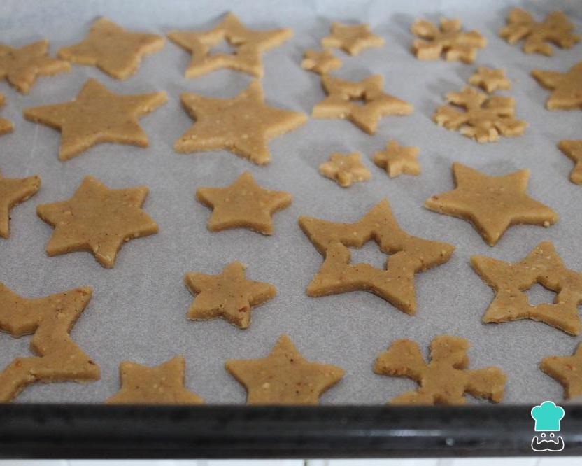 Dica: Para usar os biscoitos como decoração da árvore de Natal faça um furinho neles com um palito e coloque um pouco de papel alumínio enrolado nesse furinho, para que não feche na hora de assar. Asse do jeito indicado abaixo e retire o papel alumínio somente depois dos biscoitos esfriarem.