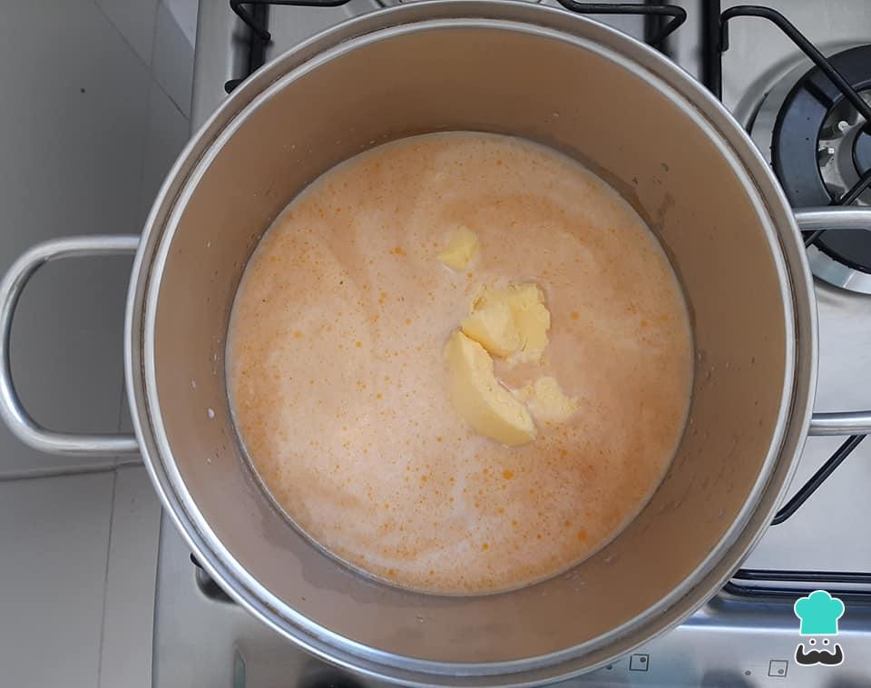 Comece preparando a massa do bolinho, levando ao fogo médio o leite, a manteiga, o caldo do cozimento do frango, o sal, a pimenta do reino e a páprica picante até levantar fervura.