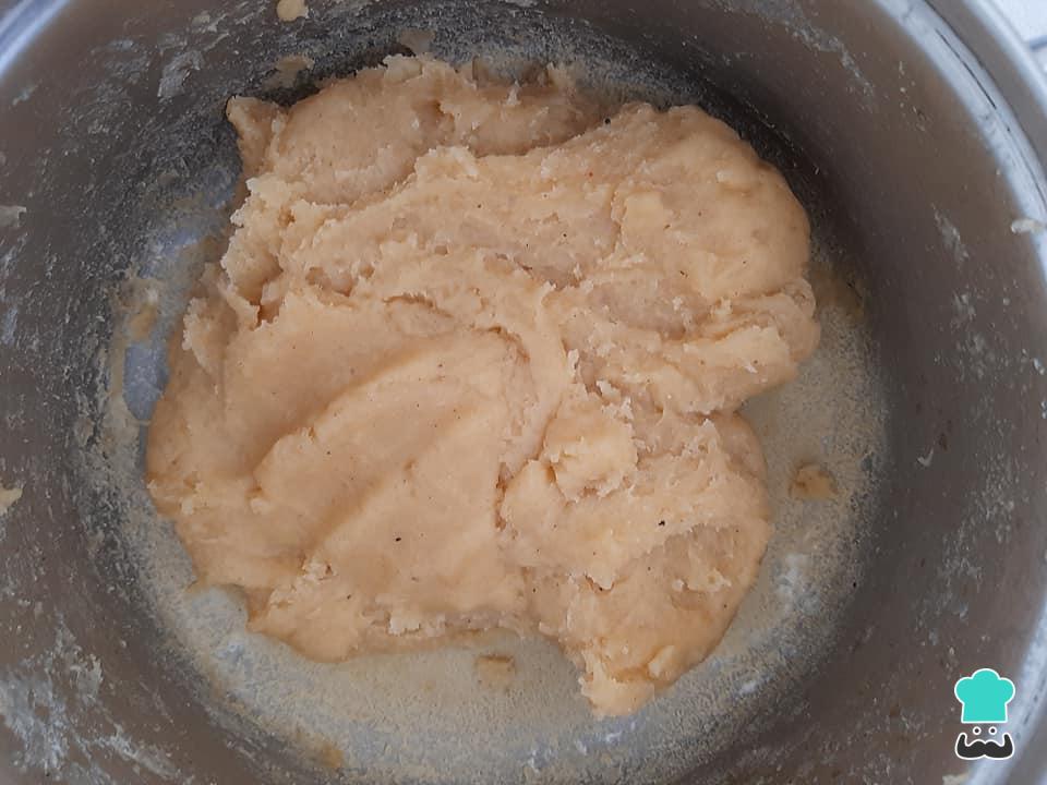 Abaixe o fogo e acrescente a farinha de trigo de uma vez. Com uma colher firme misture muito bem envolvendo a farinha de trigo ao líquido. Continue mexendo por 5-10 minutos, para que a farinha cozinhe e não fique com gosto de farinha crua. A massa irá se soltar do fundo da panela, pode desligar o fogo em seguida.