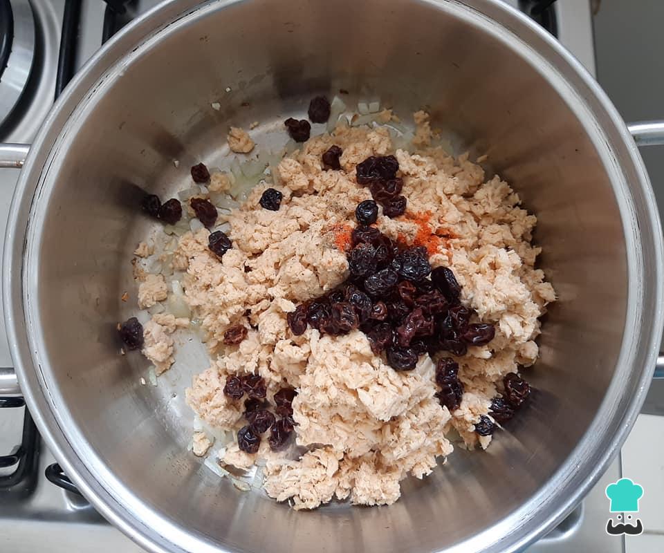 Para o recheio do salgadinho boliviano comece por refogar a cebola e o alho picados no azeite de oliva. Em seguida, acrescente o frango cozido e desfiado, a pimenta dedo-de-moça picada e as uvas passas.