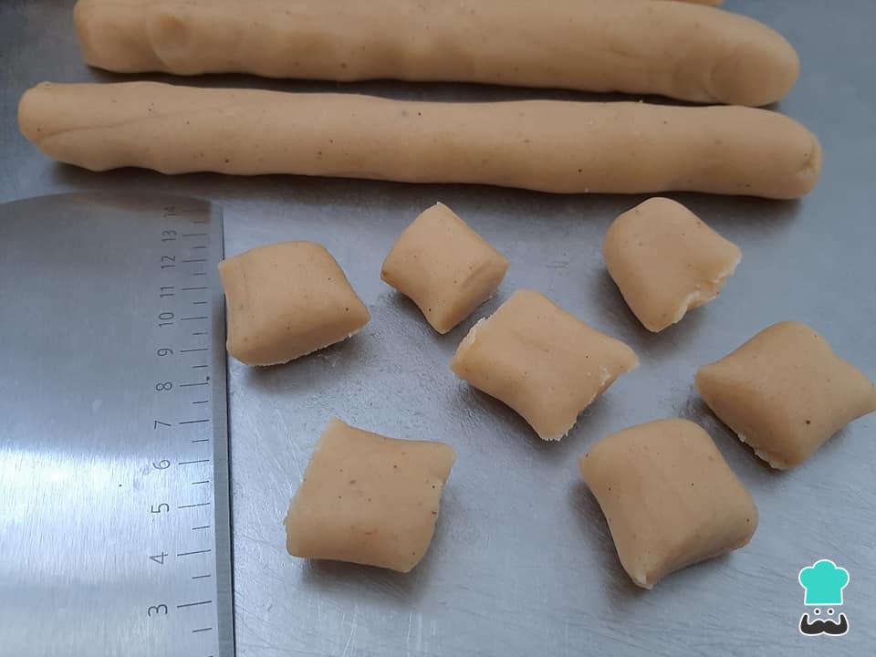 Forme rolos com a massa e, em seguida, corte pedacinhos de tamanhos iguais, como mostra a foto.