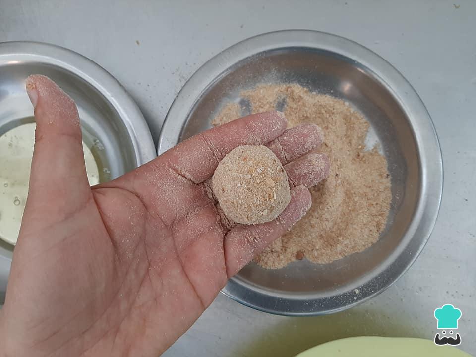 Passe os bolinhos na clara de ovo e, em seguida, na farinha de rosca, batendo levemente para retirar o excesso.