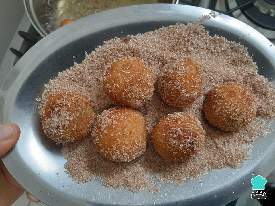 Frite os bolinhos em óleo quente até ficarem levemente dourados. Em seguida escorra-os numa peneira, para retirar o excesso de óleo, e passe-os numa mistura de açúcar e canela em pó - confie, essa combinação vai dar uma suavizada na ardência do recheio!