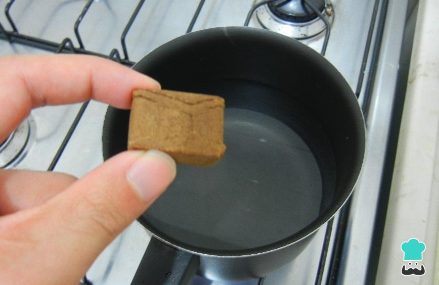 O primeiro passo da receita de bolinho caipira de frango é preparar a massa. Para isso comece por dissolver os tabletes na água.