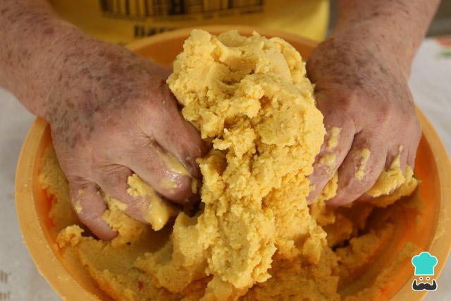 De seguida coloque as farinhas em uma tigela junto com o óleo. Misture e adicione a água aos pontos, enquanto mexe, até ficar homogênea e fácil de modelar. Se quiser adicione um pouco de sal. Reserve.