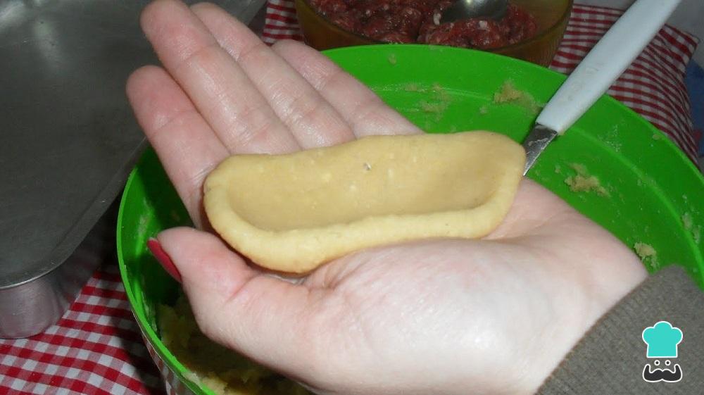 Volte a amassar a massa. Retire um pedaço dela e achate na mão, depois coloque uma porção do recheio cru e feche em forma de bolinho alongado.