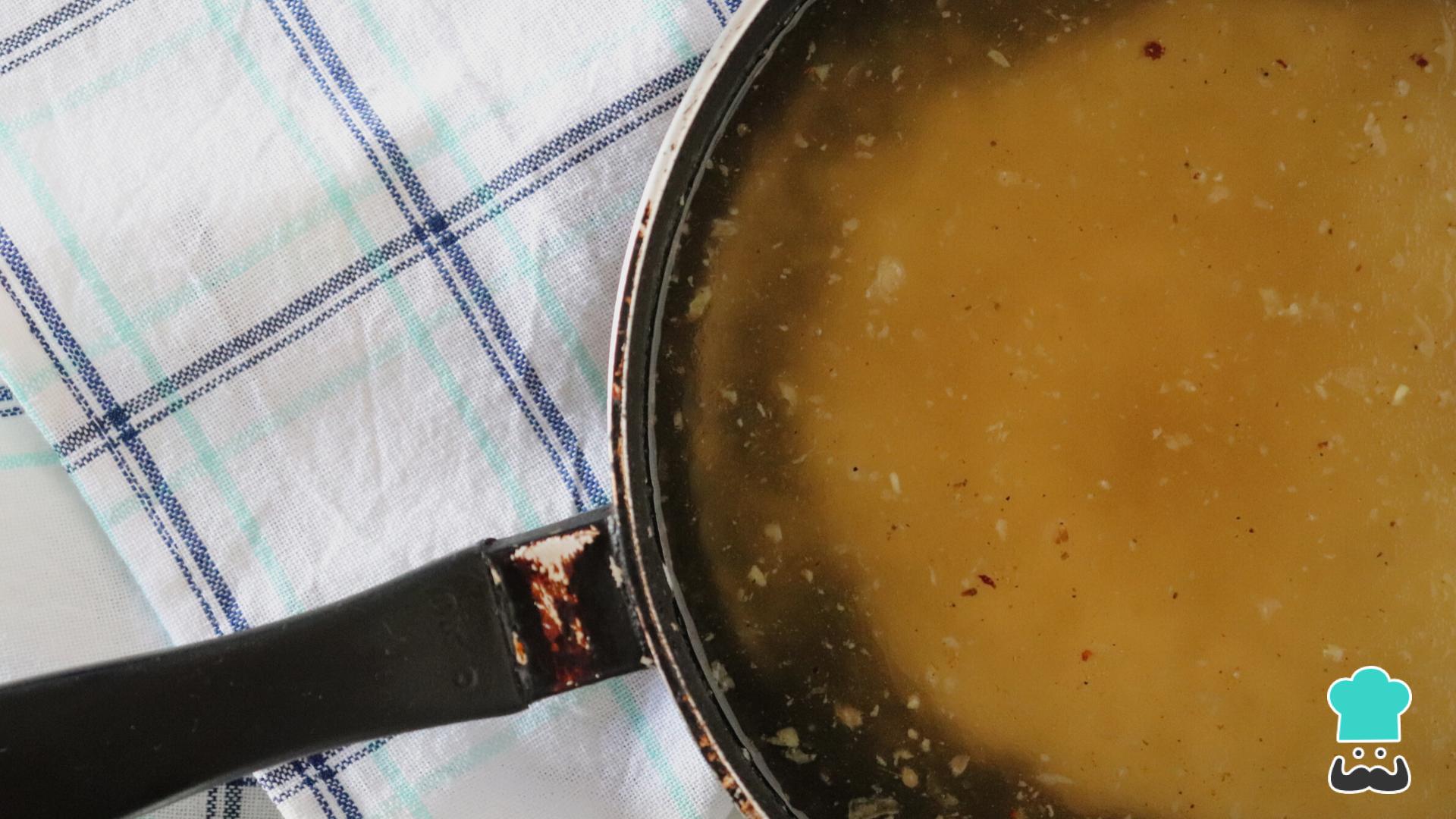 Leve uma panela ao fogo e refogue o alho e a cebola na banha. Acrescente o cominho a gosto (esse tempero é bem forte, então use com moderação). Despeje o caldo de legumes e deixe ferver. Reserve.