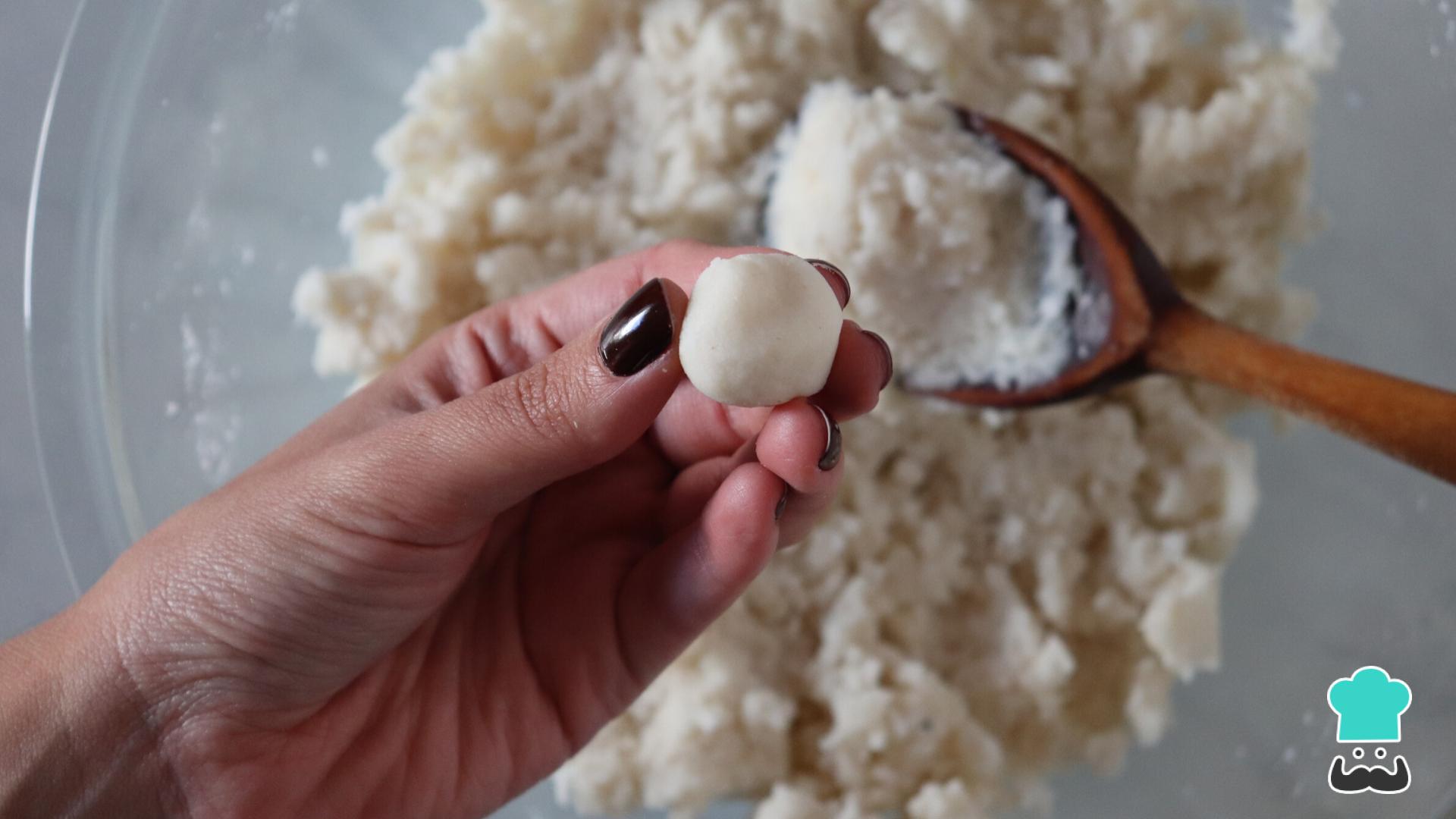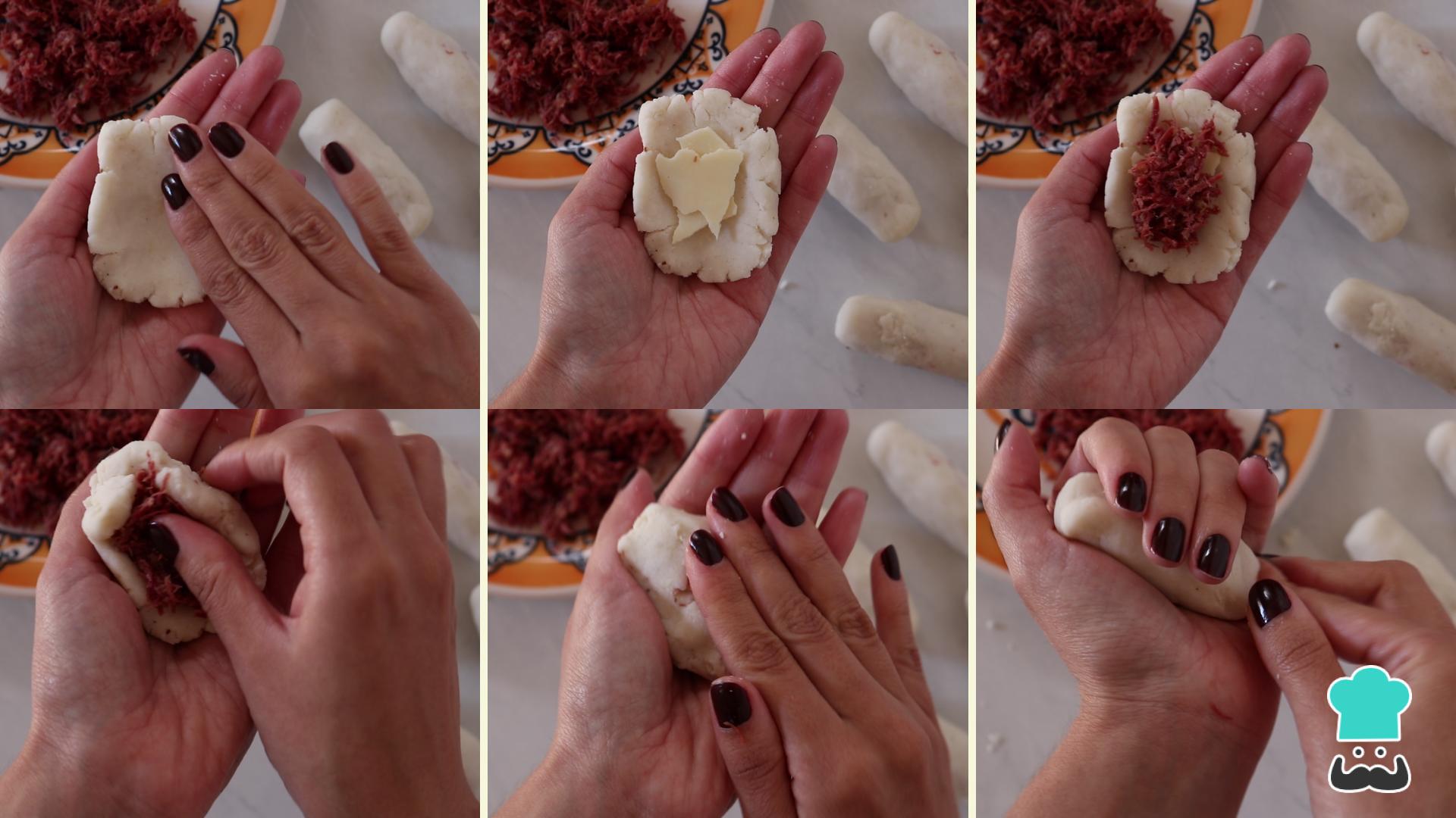 Você nunca fez um salgado antes? Fica tranquila(o) que essa massa é muito fácil de trabalhar e na foto abaixo eu te mostro os movimentos bem simples que você tem que fazer para rechear esse bolinho e deixá-lo com a cara do tradicional de Jacareí (o pedaço de muçarela no recheio é opcional)!