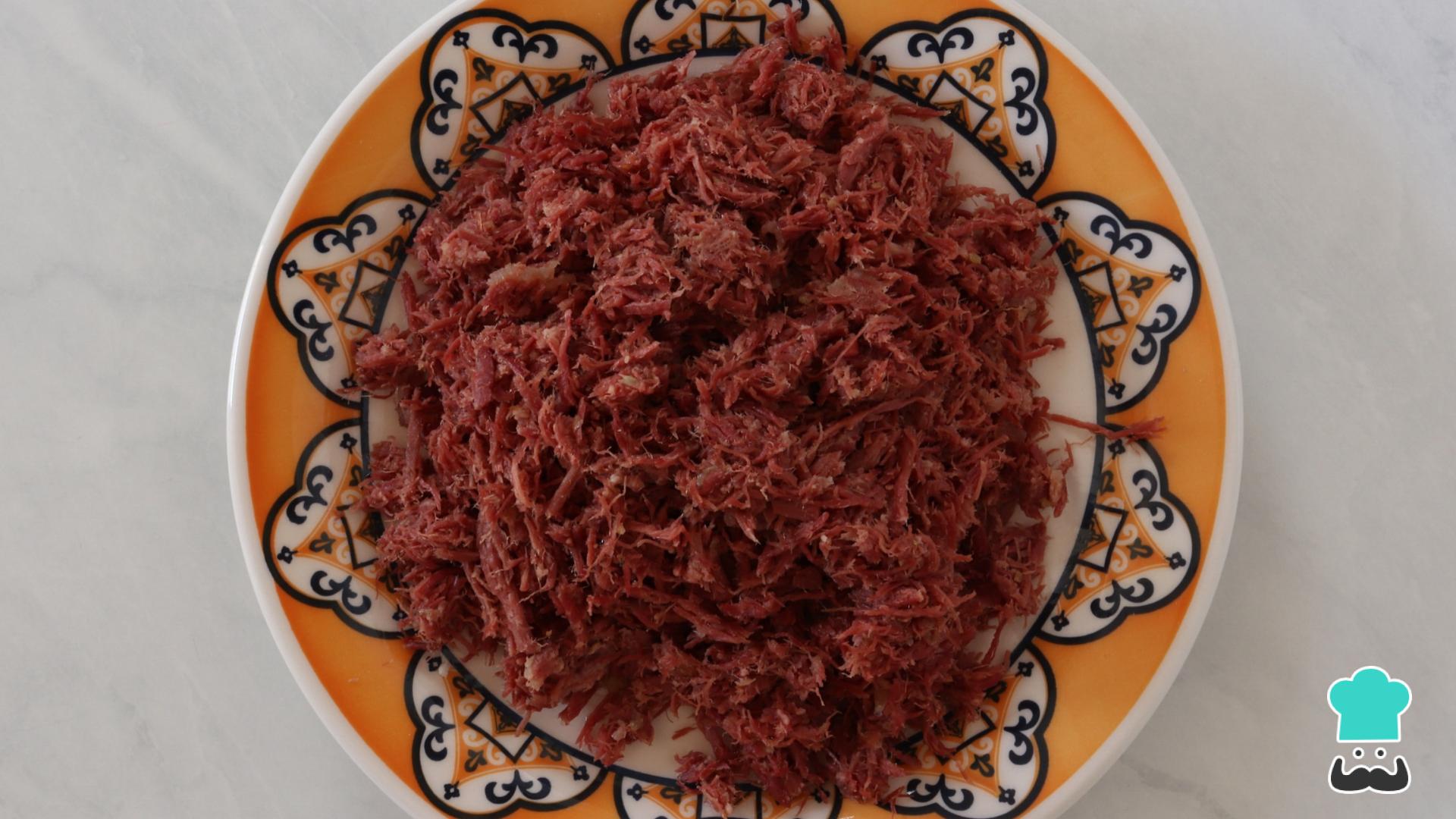 A nossa sugestão de recheio é carne seca. Ela já deve estar dessalgada (ou seja, deixada de molho por, pelo menos, 24 horas), cozida na panela de pressão e desfiada (nós usamos multiprocessador mas você pode também pode desfiar com um garfo). Refogue-a levemente no azeite com alho e cebola.
